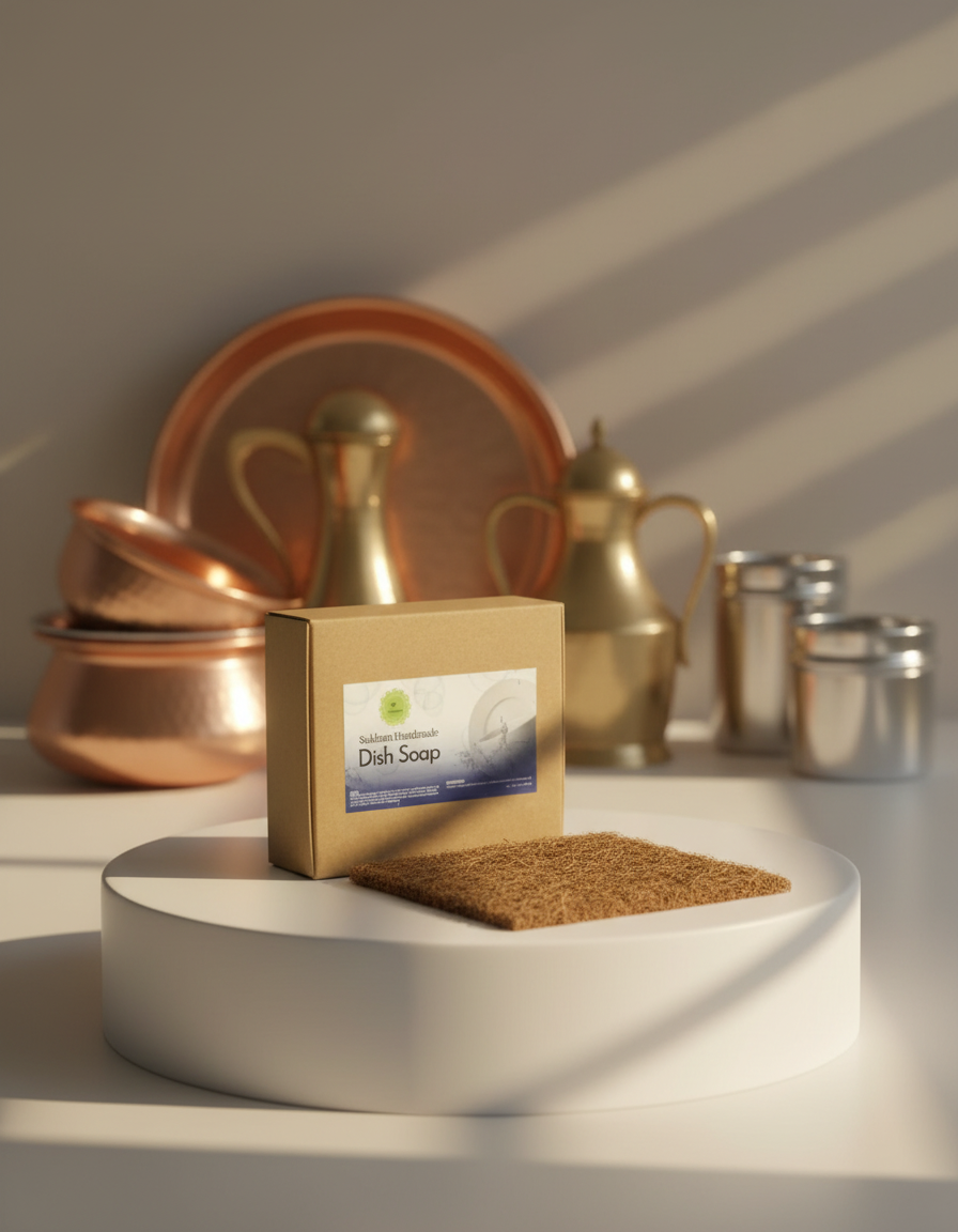 Natural dish soap paired with a biodegradable coir scrubber for effective cleaning. Cuts through grease while staying gentle on utensils. The coir scrubber adds natural scrubbing power without plastic waste. A complete sustainable kitchen solution. Clean dishes, lower footprint.