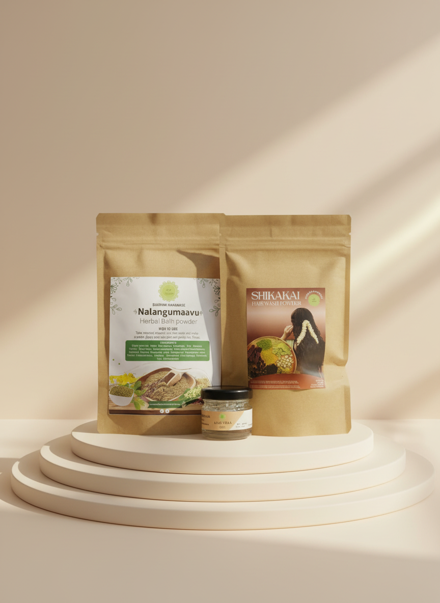 This is a full traditional cleansing ritual. Herbal Bath Powder for the body, Nalangumaavu for brightening and gentle exfoliation, and Shikakai for natural hair cleansing. It’s slow care. But slow care builds stronger skin and hair.
